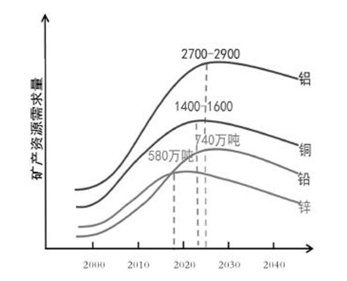 王安建教授預(yù)測,達到峰值的礦產(chǎn)需求總量會很高。預(yù)計鋼鐵消費的峰值大致是在7億噸~7.5億噸;能源消費的峰值大約出現(xiàn)在2030年,大約消費40億~42億噸;我國銅的消費峰值大致在2022年~2025年,大約消費1300萬噸~1500萬噸;鋁的消費峰值大致在2022年~2025年, 消費2700萬噸~2900萬噸;鉛、鋅的消費峰值大致在2022年左右,鉛大約消費680萬噸~700萬噸,鋅大約消費770萬噸~790萬噸。